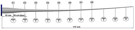 The layout of MPU-6050 accelerometers (A) and fiber Bragg gratings (FBGs) placed along the length of a wind turbine blade. The sensor number corresponds to its location on the blade in 10 cm intervals.