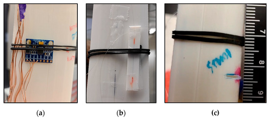 (a) Typical MPU-6050 assembly on the blade. (b) Typical FBG assembly on the blade. (c) Typical 0.5 cm “crack” defect added to the blade. This defect was added 100 cm away from the blade hub.