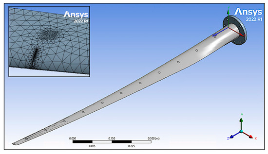 The CAD model used for 3D printing the blade and baseplate was added to ANSYS Workbench 2022 R1 [65] as a single blade structure. The sensors were modelled as distributed mass components on both sides of the blade. An overview of the simulated blade is shown in Figure 8.