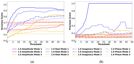 When a flaw is implemented, transmissibility changes also occur with other pairs of sensors within the sensor matrix. For example, if a defect occurs near sensor i, a change in transmissibility will be found in all sensor pairs associated with sensor i, not just between sensor i and its adjacent sensors. The Total Method in Equation (9) uses a variation of the Damage Indicator from [46] in Equation (8) and sums all the transmissibility changes from all the available pairs for each sensor at each natural frequency. This formula yields a value, for the total transmissibility change for a sensor in the sensor matrix, where m is the total number of sensors that can be paired with sensor i.