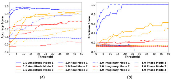 The blade was attached to an optical table using the 3D-printed baseplate and 4 screws. For each blade condition, the blade was struck with an impact hammer at a random location to provide excitation. The vibration response was measured by both sensor arrays using an Arduino Uno R3 [62] (Arduino, Monza, Italy) for the accelerometers and a combination of a laser and interrogator from Ibsen Photonics [63,64] (Ibsen Photonics, Farum, DK) for the FBGs. Separate impact tests were conducted for the accelerometers and the FBGs for each blade condition. The data for each test were filtered and converted to the frequency domain using a fast Fourier transform (FFT) in a Python 3.10.4 script. Five tests were completed for a baseline condition (undamaged blade) as well as for each defect condition. The first three natural frequencies were determined for each test. The natural frequencies selected for transmissibility analysis were based on the median value of the five trials. The transmissibilities of the five trials for each possible pair of sensors were averaged at each median natural frequency for the real, imaginary, amplitude and phase. The transmissibility change between the baseline and each defect condition was then determined for each sensor pair.