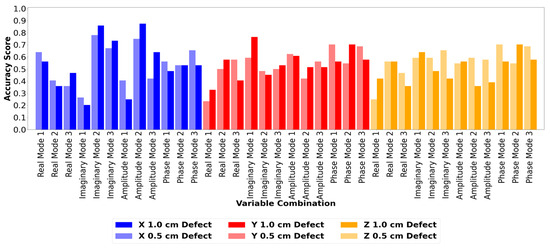 Non-destructive defect detection on the model turbine blade was assessed by means of strain transmissibility using combinations of variables from four different categories: defect size, vibration mode, strain orientation, and signal type. A total of 24 different variable combinations were used to analyze the transmissibility changes experimentally along a single axis with the FBGs. The ANSYS model was able to examine the strain in all three axes, so 72 variables were tested numerically. These variable combinations are listed in Table 3 and were all assessed to determine which best determined the existence and location of a flaw. Further analysis of the viability of the strain transmissibility concept was then pursued for this optimal choice of the four variables.