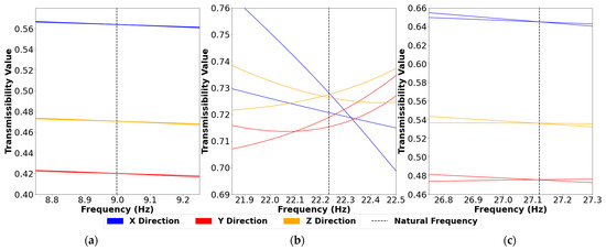 In the first mode, the strain transmissibilities remain relatively constant around the natural frequency in all three directions, regardless of the magnitude and location of the applied forces. Transmissibility variations are slightly larger in the third vibration mode but still converge to the natural frequency in all orientations. This suggests that when using modes one and three, correct identification of the natural frequency is not critical. The X and Y strain transmissibility pairs do not converge at the second natural frequency, which demonstrates the importance of the sensor’s measurement direction. The X and Y directions fail to identify defects in the second mode as they do not follow the theory in Equation (7), and the transmissibility values depend on the applied force. The Z direction transmissibilities converge close to the second natural frequency but diverge at frequencies that are immediately adjacent. Therefore, to use the mode two transmissibility in the Z direction, one must accurately identify the natural frequency, as inherent transmissibility variations around the natural frequency can obscure those caused by damage. Experimentally, accurate identification of the second mode natural frequency was difficult; this explains the inability to detect defects using strain transmissibility with the second vibration mode.