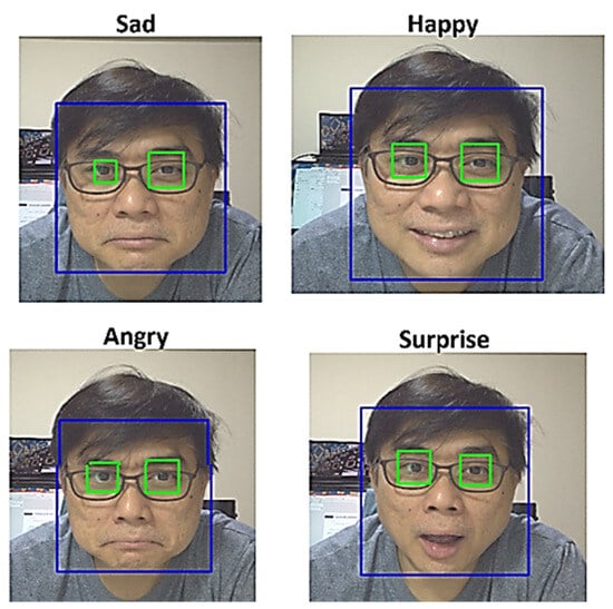 The camera is linked to the Nvidia Jetson Nano through the CSI socket. Positioned above the MTY robot, the camera creates the illusion of the MTY robot “observing” the user. On the Nvidia Jetson Nano, the open-source face and emotion code developed by Priya Dwivedi is being used to train the models. Four classifications were trained for inference. An example of an image captured by the Nvidia Jetson Nano is depicted in Figure 20. Our proposed work classifies emotions into four categories: happy, neutral, sad, and angry. These specific emotions were chosen because they represent a broad spectrum of basic human emotional states. This categorization helps in effectively recognizing and responding to the user’s emotional needs, which is crucial for the robot’s interaction with the elderly. The selection of these emotions is likely due to their fundamental nature in human emotional expression, making them easily recognizable and significant for meaningful social interactions. This allows the robot to engage with users in a manner that is empathetic and responsive to their emotional states, thereby enhancing the overall user experience and promoting emotional well-being.