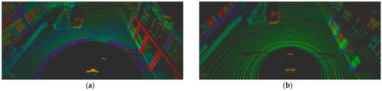 Sensor intensity and resolution comparison in same environment. (a) Point cloud data of Velodyne HDL-64e; (b) Point cloud data of Ouster OS1-64. The color of each point is displayed in a different color according to the intensity value distribution of each sensor.