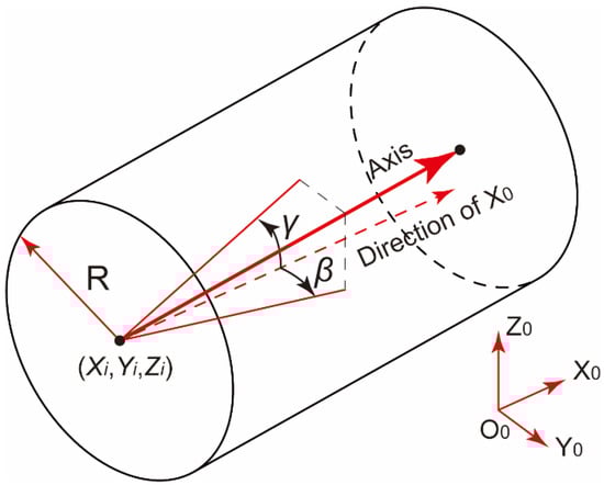 In previous studies, the pose of the cylindrical component axis, represented by five parameters in , was ensured through V blocks or specialized circular fixtures []. Alternatively, precise measurements are achieved through structured light scanning methods []. However, these methods still prove ineffective in accurately measuring the assembly rotation angle, , for cylindrical components with flanges.
