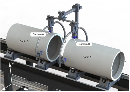 Optical devices such as encoders and laser rangefinders are employed during operations to ensure that the support mechanism moves the mating surfaces of the two cabins to a pre-calibrated imaging plane. This guarantees a fixed value for during each measurement. Camera groups and capture images of the corresponding pairs of mating features on the end face, extracting the coordinates of their center points in their respective CWCSs, denoted as and . Therefore, the CWCS of each camera can be illustrated as in Figure 4.