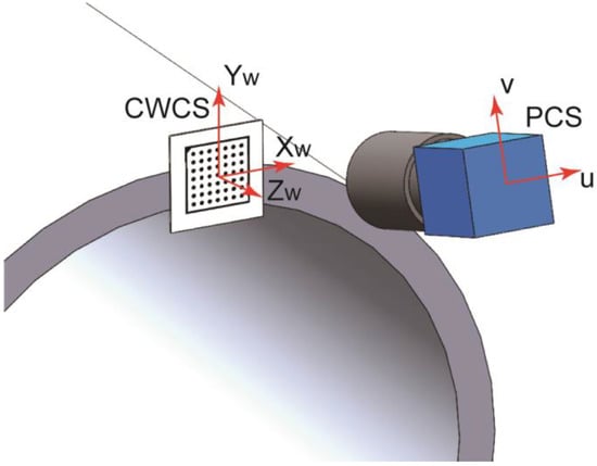 For vision measurement, camera calibration is essential. Calibration provides the necessary camera parameters, which include both intrinsic and extrinsic parameters. The intrinsic parameters encompass information such as the camera’s focal length, distortion, and pixel parameters, while the extrinsic parameters refer to the camera’s pose relative to the imaging plane []. As shown in Figure 3, the extrinsic parameters indicate the transformation relationship between the coordinate system defined by a specific calibration board center and the camera pose. Here, this calibration board coordinate system is referred to as the camera’s world coordinate system (WCS). However, as each camera has its own distinct WCS corresponding to its measurement field, it is referred to as the camera world coordinate system (CWCS) for distinction. Therefore, calibration establishes the mapping relationship between the camera pixel coordinate system (PCS) and the CWCS.