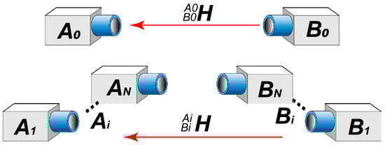 CWCS transformation can be accomplished through a homogeneous transformation matrix, , for cameras capturing mating feature pairs. For a given mating feature pair, position measurements by camera groups A and B yield the respective coordinates and in their CWCS. Their relationship can be expressed as follows:
