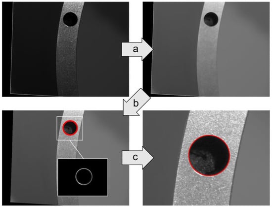 In Figure 5, step (a) involves a Gamma transformation to enhance the dark regions of the image for improved contrast in the measurement features, facilitating threshold segmentation []. Then, median filtering is utilized to smooth the image and reduce the adverse effects of texture on threshold segmentation []. Step (b) employs threshold segmentation to extract the processing region of interest (ROI) where the hole edges are located, helping determine the hole’s edge position. Step (c) performs an intersection operation between the ROI and image after the Gamma transformation to determine the edge extraction region. Finally, the Canny operator is applied to extract hole edges, followed by elliptical fitting to determine the position of the hole center in the image []. This process yields a hole center position in its CWCS.