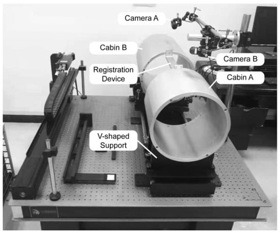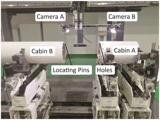 An experimental system was constructed to validate the accuracy of the proposed method, as illustrated in Figure 7. In the setup, holes are positioned on the flanges of the cabin and target cabin segments. Simultaneously, the alignment of the two cylindrical components is ensured through a V block to maintain coaxiality.