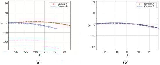 The trajectory points captured by Camera A are denoted as , and those captured by Camera B are denoted as . Subsequently, undergoes a pre-transformation using Equation (3), resulting in . Substituting and into Equations (7) and (13), respectively, with initial values set to for parameters and for , the pose and scaling parameters in Table 1 were obtained using genetic algorithms implemented in the Matlab optimization toolbox.