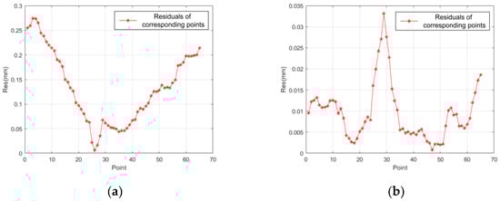 As shown in Figure 9a, a residual curve without scale correction indicates significant errors. Therefore, in addition to differences in rigid body transformation, there is also a difference in scaling between the true coordinate systems of the two cameras. Therein, the results obtained via this transformation are not ideal. Comparatively, the registration errors with scale correction shown in Figure 9b decreased by an order of magnitude.