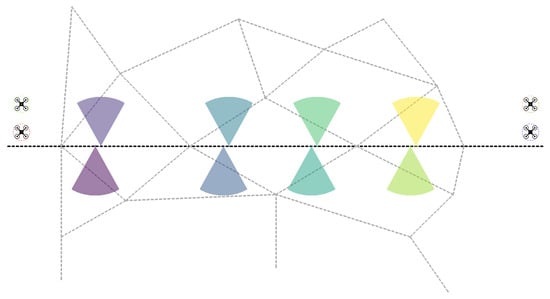 Another important difference is that when the costs in a sensor network are to be optimized, in most of the papers, since sensors are abundantly available, the focus is on putting unnecessary sensors to sleep and activating them only when needed [15,16,17]. In our case though, the number of sensors was limited, as it will become clear later, they could not provide even one-barrier coverage, so it was not permissible to disable any of them. Thus, instead of disabling as many sensors as was possible, at each time step we aimed to minimize the magnitude of rotation angles necessary to adapt to the new situation. This approach was also taken in [18]. In the case of UAVs, however, we also wanted to minimize the distance required to complete the task, just as most related articles did [19].