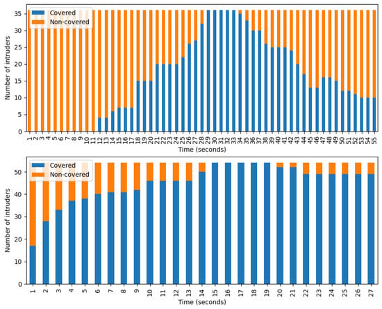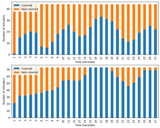 The number of covered and non-covered intruders per second. Both diagrams depict data belonging to the combined algorithm with coordination. (Top) entire playing field. (Bottom) camera-accessible region.