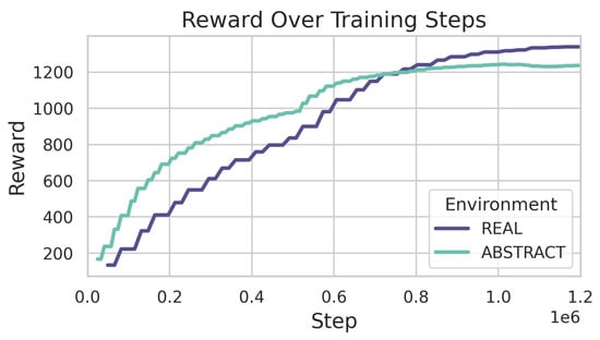 Figure 11 shows the episode rewards averaged over 100 episodes during training in the ABSTRACT and REAL environments, respectively. It can be observed that the reward values improved during training in both cases.