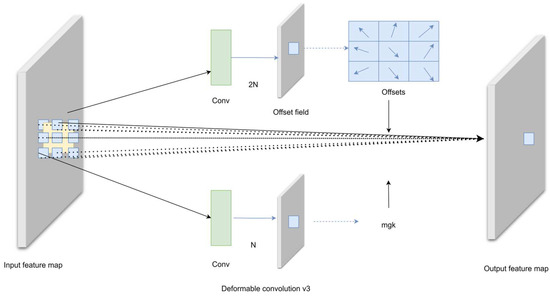 In the formula, represents the number of groups. represents the projection weight shared within each group, and represents the normalized modulation factor of the -th sampling point in the -th group, which is normalized along the dimension by the softmax function. represents each position on the output feature map y, represents the predefined sampling point, and represents the offset of each sampling point. The purpose of using the DCNv3 module is to enhance the model’s ability to extract different features. DCNv3 achieves this by learning the offset of each sample point of the convolution kernel, allowing it to adapt to the geometry of the object. DCNv3 enhances the feature extraction capabilities of transmission line defect targets of different scales by learning different optimal convolution kernel structures for different target data. The structure of Deformable Convolutions v3 is shown in Figure 2.