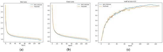 Analysis during training; (a) represents the box loss curve, (b) represents the classification loss curve, and (c) represents the map curve changes of YOLOv8n and DCP-YOLOv8.