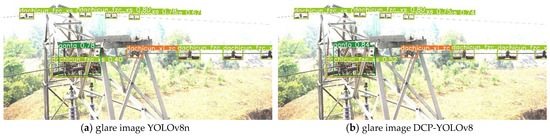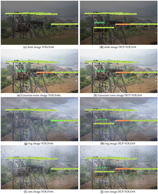 The detection results of DCP-YOLOv8 in complex environments are shown in Figure 9. It can be seen that the baseline YOLOv8n model performs poorly in foggy, rainy, and dim environments, it cannot identify the bird’s nest covered on the tower, and the detection level drops significantly when facing images containing Gaussian noise. Therefore, the baseline model has low applicability in complex environments and poor robustness to image degradation under complex conditions. Compared with the baseline YOLOv8 model, DCP-YOLOv8 can accurately detect all defective targets in common complex environments, with a higher detection accuracy and better adaptability to these complex environments. In summary, these experiments demonstrate the effectiveness of our proposed method in improving the robustness of the YOLOv8 model in the face of image degradation in complex environments. These results are significant for practical applications where the model must perform accurately under challenging conditions.