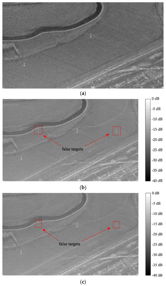 Figure 14a is the original SAR image for simulation, and there are two strong targets―lighthouses in the image. Figure 14b is the simulation result of distributed target imaging without compensating the phase noise in the receiver. The quality of SAR images is significantly reduced, the image resolution is low, and false targets appear in the imaging results. Figure 14c shows the imaging results of distributed targets after phase-noise compensation using existing methods. Figure 14d is the imaging result of the distributed target after phase-noise compensation using the method proposed in this paper. It can be seen that the existing method for phase-noise compensation can suppress the false target to a large extent, but there are still weak false targets in the imaging results of distributed targets. However, the phase-noise-compensation method proposed in this paper can completely suppress the generation of false targets, making the SAR image clearer and more focused.