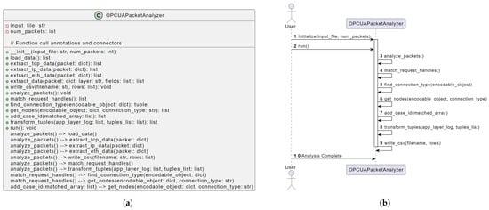 Implementation design of the OpcuaPacketAnalyzer class. (a) Class diagram. (b) Sequence diagram.