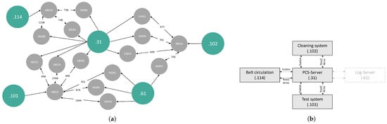 Understand. Initially, we attempted to read the PCAP file using pyshark (https://github.com/KimiNewt/pyshark), but faced limitations, such as no support for OPC UA. We then exported the network data with Wireshark to JSON, specifying relevant OPC UA service ports. The Wireshark OPC UA extension aids packet interpretation, enabling the creation of the network structure (see Figure 3a) for an overview. We identified the central network’s IP address as .31 for the Process Control System (PCS) server. Among 24,445 OPC UA packets, we found 24,421 OPC UA message packets and 24 OpenSecureChannelRequest packets, which we did not further analyze. In total, 9244 packets have been sent by the PCS, the PCS has received 9247 packets, and 2965 were sent to the protocol server. The network data reveal that the PCS requests machine information through read and write requests. Publish and response packets lack production-relevant content, possibly due to an OPC PubSub-based notification system. Publish request packets originate from the PCS or the log system and are addressed to the cleaning, conveyor, and test systems, resulting in publish response packets. As the packet timestamps lack unique polling information, we exclude publish and subscribe packets from the event generation process.