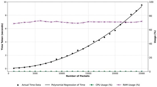 Event Log Generation Performance. Our experimental setup explores OPC UA packet processing performance by incrementally analyzing varying loads. Key metrics include time, CPU, and RAM usage. We start with 1000 packets, increasing by 1000 in each run until dataset exhaustion. Visualizing the results in Figure 4, packet analysis time shows a quadratic relationship with packet count, confirmed by a polynomial regression (black line). As expected, processing time increases with more packets. CPU and RAM usage (green and magenta lines) remain consistent, with occasional RAM spikes and steady CPU usage. Results indicate a significant computational demand increase with rising packet count. The polynomial regression in the experimental setup is as follows: