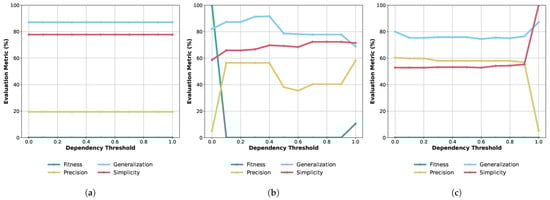 Process discovery algorithms’ quality with varying thresholds. (a) Alpha miner; (b) Heuristic miner; (c) Inductive miner.
