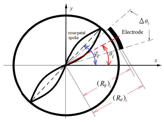 where is the number of electrodes in one group with the same applied voltage, is the thickness of each electrode in one group, is the mean radius of the gap between each electrode and outside ring in one group of electrodes, and is the central angle in front of each electrode in one group of electrodes (Figure 1).
