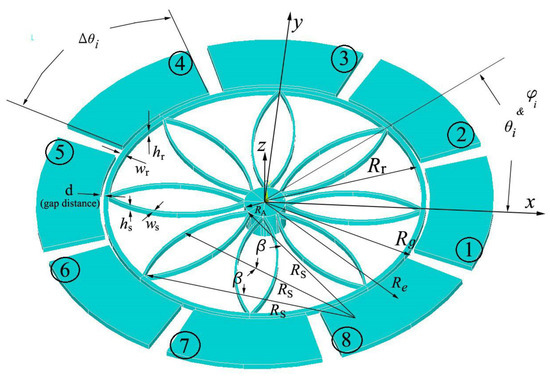 To show the applicability of Equation (17) and examine the effect of the electrostatic force on the dynamic behavior of the ring resonators, a ring with eight spokes and eight electrodes is designed and analyzed (Figure 2). The electrodes are positioned circumferentially outside the ring in the form of an arc with a central angle of . The center of the electrodes is located at the position of the spokes ( = ) to have maximum deflection of the spokes which results in the maximum elastic force.