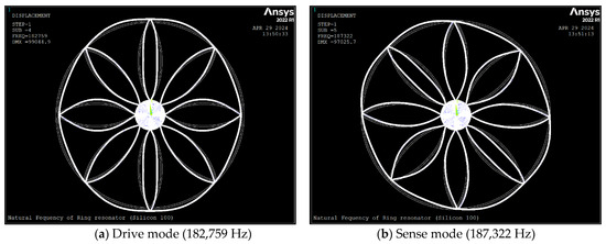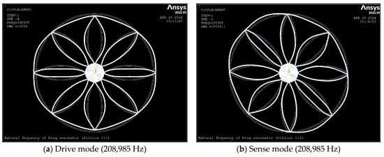 The Figure 3 and Figure 4 shows the natural frequency and the degenerate mode shapes for the n = 2 mode of vibration of the ring for silicon [111] and [100]. Table 3 depicts the non-dimensional frequencies calculated by FEM and compared with Equation (19). As seen, using anisotropic silicon [100] induced about a 2.4% frequency split, where drive and sense frequencies increased by about 4.8% and 7.4%, respectively. The FE results show that the mode shape of the ring is a combination of the general ring vibration and the local vibration of the ring between spokes which occurs due to the low stiffness of the ring. Additionally, comparing the results of FEM and Equation (19) reveals a deviation of 13.2%. This is partially caused by the ring’s local vibration between the spokes, which the analytical method ignores.