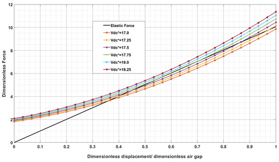 Figure 5 depicts non-dimensional elastic and electrostatic forces as a function of non-dimensional displacement in drive coordinates for different values of non-dimensional applied voltage. Here the pull-in voltage is determined for the different dimensionless air gaps when the elastic force line acts as a tangential line to the curves of different voltages. The tangential point of the curve at the dimensionless air gap with a voltage corresponds to the pull-in voltage.