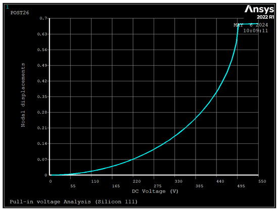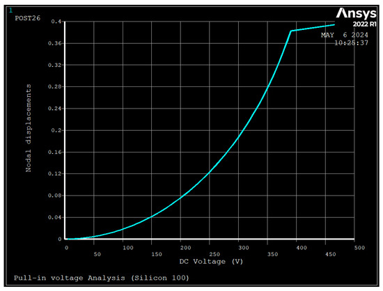 Figure 6 and Figure 7 depict the results of FEM for calculation of pull-in voltage, and Table 4 depicts the non-dimensional pull-in voltage and pull-in displacement calculated by FEM and compared with Equation (23). The figure shows the displacement of the nodes as the DC voltage increased, and at one point, instead of increasing the displacement, became constant, which shows the pull-in voltage as the device collapsed at that voltage point.