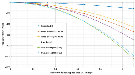 Figure 8 depicts the variation in resonance frequencies of the ring resonator as a function of non-dimensional bias DC voltage applied to electrodes numbers 1 and 5, calculated using Equation (24) and FEM with silicon [111] and [100]. As we mentioned earlier, the frequency shifts due to the high DC bias which creates the electrical spring constant due to the electrostatic softening of the stiffness. As seen, both methods have the same tendency, and by increasing bias DC voltage, the shift of resonance frequency increases. The rate of shift of frequency increases by increasing bias DC voltage and the deviation between analytical approach and numerical method increases by increasing applied voltage.
