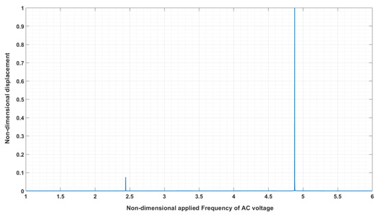 As mentioned, to have maximum energy transfer from drive mode of vibration to sense mode due to rotation, the resonator is excited in resonance frequency. To determine the resonance frequency of the ring resonator, a non-dimensional DC bias voltage of and AC of is applied to electrodes No. 1 and 5. Equation (17) is used to determine the harmonic response (Figure 9). So, the figure depicts the sweep of frequency of the AC voltage versus the displacement obtained at electrodes 1 and 5, which is where the n = 2 drive mode will have maximum displacement.