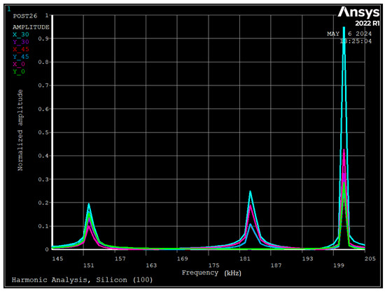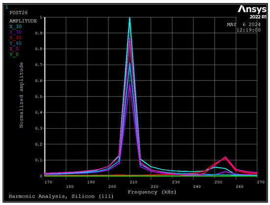 Figure 15 depicts the FE results for harmonic analysis of the ring with silicon [100], due to applied voltages of 1.0 V DC and 0.1 mV AC. Here we have obtained multiple peaks and all of them correspond to different modes, and we can differentiate them by the radial and tangential displacements in different electrode positions. The first peak is at 152 kHz, where the displacement of all points in radial and tangential directions are in the range of 0.1 and 0.2. Since all displacements are almost the same, it can be concluded that it is the rocking mode and matches well with the experiments (Figure 14). The second resonance frequency occurs at 183 kHz, where radial displacements at 0, 30, and 45 degrees are 0.20, 0.25, and 0.11, and tangential displacements are 0.0, 0.0, and 0.11, respectively. Since tangential displacement at 0 degrees is zero, it is n = 2 vibration; however, as maximum displacement occurs at 30 degrees, the mode shape is the interaction of local and global vibration. Compared with the experiment results, it reveals a 5% deviation that could be due to damping or fabrication errors. Since both analytical and experimental approaches have considered local and global vibration, the deviation is reduced from 13.2% to 5%. The third resonance occurs at 201 kHz which matches well with the experiment. The radial displacements at 0, 30, and 45 degrees are 0.42, 1.0, and 0.24, respectively. Since after this frequency, all tangential displacements are opposite to zero, it is the interaction of vibration and torsional modes.