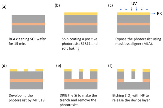 A p-type 100 mm diameter silicon-on-insulator (SOI) wafer (Ultrasil LLC, Hayward, USA) with a device layer of 25 μm (0.001–0.003 Ω⋅cm), SiO2 box layer of 5 μm, and handle layer of 500 μm (0.005–0.02 Ω⋅cm) was used as starting material. The wafer was first cleaned through an RCA (Radio Corporation of America, New York, USA) process (Figure 11a). Then, Shipley S1811 photoresist was applied to the wafer via spin-coating at 2000 rpm using a Brewer Science CEE 200X spinner. The wafer then underwent a soft bake at 120 °C for 2 min on a Brewer Science 1300X vacuum hotplate (Figure 11b). Its pattern was exposed using MLA (MLA-150, Heidelberg Instruments, Heidelberg, Germany), with UV laser set to 405 nm, exposure at 125 mJ/cm2 dose, and -2 defocus, and developed in MF-319 developer for 45 s (Figure 11c,d). Then, the pattern was transferred into the SOI substrate by the deep reactive ion etching (DRIE) technique using Plasmalab system 100 ICP380 (Oxford Instruments, Abingdon, United Kingdom) with a high-density 380 mm ICP Source (2 MHz, 3 kW). The DRIE experiment was performed by using the Bosch process with an etching (160 sccm SF6 and 160 sccm C4F8 flow rates) cycle RF power of 1000 W. During the etching step, SF6 plasma isotropically etches silicon and would only be allowed to etch for a limited depth, which is usually less than one micron, while the C4F8 step deposits a passivation layer to protect the sidewalls, thus achieving anisotropic etching. The Bosch deep and etching cycle times were kept at 5 s and 7 s, respectively (Figure 11e). To minimize the notching effect, high-frequency (13.56 MHz) etching was applied for 100 cycles, followed by low-frequency (350 kHz) etching for the final 10 cycles, a critical adjustment that significantly reduced the charge accumulation and consequent deflection of etching ions, effectively reduce notching. The etching depth was monitored using a profilometer (DektakXT, Bruker, Billerica, USA) to ensure consistent results across different DRIEs.. Subsequently, the photoresist was removed ultrasonically in acetone for 5 min. Then, it was immersed in IPA for 5 min. Finally, the box layer was etched with 49% hydrofluoric acid (HF) for 10 min to release the device layer (Figure 11f). The final device was packaged by wire bonding (West-Bond Inc., model 4546E). Figure 12 depicts the SEM of the fabricated ring resonator.
