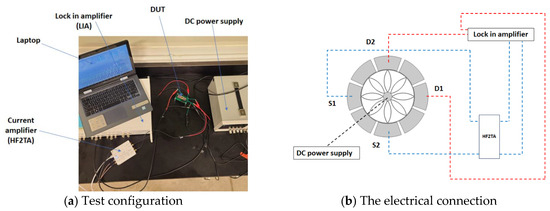 To determine how the resonator responds to electrical actuation and modulation, its resonance frequency is measured using the lock-in-amplifier (LIA). The test configuration is displayed in Figure 13a. Figure 13b depicts the electrical connection between the DC power source, LIA, and ring. To preserve the electrical polarity between the electrodes and the ring resonator, a DC power source is attached to the ring anchor and provides a DC voltage of 1.0 V. The AC voltage of 10 mV with 0 deg phase is applied to Electrode 1 and 10 mV with 180 deg phase to Electrode 3. As shown in the previous model section, the drive mode of the ring resonator is elliptical in shape. So, we are forced, with a small electrostatic force, to vibrate the device in the drive mode. We can accomplish this by adding the electrostatic force to the anti-nodal points which are Electrodes 1, 3, 5 and 7 as seen in Figure 2. Here, Electrode 1 and 5 and Electrode 3 and 7 are in pairs to form the elliptical shape. The response, represented by floating potentials, is obtained from the electrodes (S1 and S2) across from each other. The small displacement causes the sensed signal to typically be in the lower range, necessitating the use of a current amplifier. Thus, the output signal is amplified before it reaches the LIA with the aid of a current amplifier (HFT2A). The mechanically modulated signal in the ring that was brought about by resonance is demodulated using the respective drive signal within the LIA to eliminate noise.