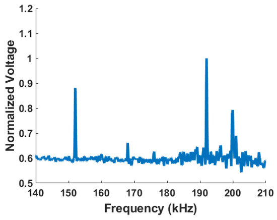 Here, we have used the LIA to perform a frequency sweep which is used to determine the resonance of the frequency. As the electrodes D1 and D2 are used to drive and S1 and S2 are used to sense, the n = 2 mode should have a large displacement. The frequency sweep is performed from 120 kHz to 220 kHz to determine the device’s resonance frequencies (Figure 14). Using the average of the initial values as a reference, the response has been shown as a frequency against the normalized voltage. The drive mode of n = 2 was presented at 192 kHz and in the rocking mode at 152 kHz.