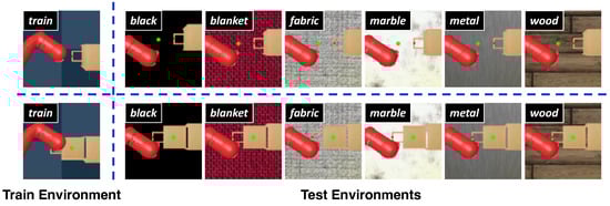 To validate the effectiveness of our method, we conducted a series of experiments on the DMControl Generalization Benchmark (DMControl-GB) [17], which is based on continuous control tasks from the DeepMind Control Suite (DMC) [18], and the DrawerWorld with texture distortions [19], which is based on continuous robot control tasks from Meta-World [20]. The first benchmarking platform provides a fixed background setting for model training and different unseen backgrounds including random colors and video backgrounds for the generalization testing of the model, as shown in Figure 1. Two modes, easy and hard, exist in both random colors and video backgrounds, and we choose the more challenging settings. The second benchmarking platform, named as DrawerWorld with texture distortions, comprises two tasks: DrawerOpen and DrawerClose. As shown in Figure 2, these tasks involve controlling a robot to open and close a drawer, respectively. The model is trained under the standard grid texture, designated as train, and subsequently evaluated within the same train texture as well as in various other environments, including black, blanket, fabric, metal, marble, and wood textures.