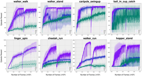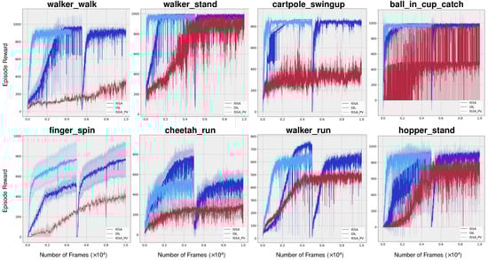 - Tassa, Y.; Doron, Y.; Muldal, A.; Erez, T.; Li, Y.; Casas, D.d.L.; Budden, D.; Abdolmaleki, A.; Merel, J.; Lefrancq, A.; et al. Deepmind control suite. arXiv 2018, arXiv:1801.00690. [Google Scholar]