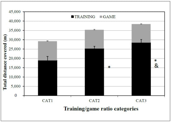 TD differences between CAT1, CAT2, and CAT3 in training and game. TD = total distance covered; CAT1 = microcycles with average TD training/game ratio R = 1.86; CAT2 = microcycles with average total distance training/game ratio R = 2.51; CAT3 = microcycles with average total distance training/game ratio R = 2.90. * Difference from CAT1 TD TRAINING, p ≤ 0.05, and difference from CAT2 TD TRAINING, p ≤ 0.05. & Differences from CAT2 TD TRAINING, p ≤ 0.05.