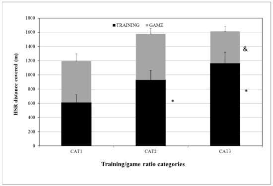 HSRD differences between CAT1, CAT2, CAT3 in training and game. HSRD = distance covered in high-speed running between 19.8 and 25.2 km/h; CAT1 = microcycles with average HSRD training/game ratio R = 1.05; CAT2 = microcycles with average HSRD training/game ratio R = 1.43; CAT3 = microcycles with average HSRD training/game ratio R = 2.60. * Difference from CAT1 HSRD TRAINING and difference from CAT2 HSRD GAME, p ≤ 0.05. & Differences from CAT2 HSRD GAME, p ≤ 0.05.