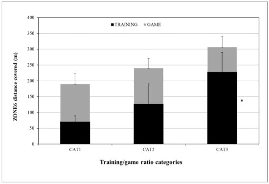 ZONE6 distance differences between CAT1, CAT2, and CAT3 in training and game. ZONE6 distance = distance covered in running speed over 25.2 km/h; CAT1 = microcycles with average ZONE6 distance training/game ratio R = 0.59; CAT2 = microcycles with average ZONE6 distance training/game ratio R = 1.13; CAT3= microcycles with average ZONE6 distance training/game ratio R = 2.91. * Difference from CAT1 ZONE6 TRAINING, p ≤ 0.05.