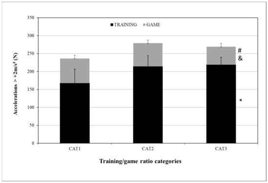 ACC differences between CAT1, CAT2, and CAT3 in training and game. ACC = number of accelerations ≥ +2 m/s2; CAT1 = microcycles with average ACC training/game ratio R = 2.42; CAT2 = microcycles with average ACC training/game ratio R = 3.29; CAT3 = microcycles with average ACC training/game ratio R = 4.45. * Difference from CAT1 ACC TRAINING. # Difference from CAT1 ACC GAME and difference from CAT2 ACC GAME, p ≤ 0.05. & Differences from CAT2 ACC GAME, p ≤ 0.05.