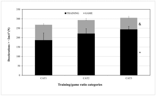 DEC differences between CAT1, CAT2, and CAT3 in training and game. DEC = number of decelerations ≥ −2 m/s2; CAT1 = microcycles with average DEC training/game ratio R = 2.28; CAT2 = microcycles with average DEC training/game ratio R = 3.11; CAT3 = microcycles with average DEC training/game ratio R = 3.94. * Difference from CAT1 DEC TRAINING and difference from CAT1 DEC GAME, p ≤ 0.05. & Differences from CAT1 DEC GAME, p ≤ 0.05.