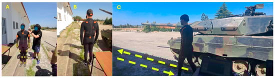 (A,B) Participant in the “n-pose” with the IMU suit with 17 sensors, represented by orange rectangles; (B) researcher who collected the anthropometric measurements to insert them into the MVN software; (C) participant performing dynamic calibration (following the yellow arrows) of the IMU system to ensure alignment of sensors to body segments, Leopard 2 A6 Main Battle Tank, and a personal computer with data acquisition using MVN Analyse software.