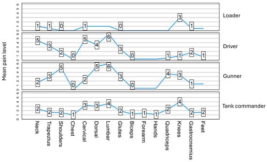 The finding highlighted the highest pain intensity in the back region, specifically during the tasks of the commander, gunner, and driver. However, the loader showed the highest intensity in the knees. These results appear to be consistent with those from previous studies, showing a higher prevalence of spinal and lower limb pain in military personnel [6,7]. Concerning each task, the commander reported higher pain intensity in the knees and back, consistent with a study among German MBT commanders [18]. The authors attributed these results to vibrations during standing. Although we did not collect vibration data and the data were collected with the MBT stopped, we can speculate that one of the reasons for these results is the presence of vibrations during the movement of the tank. According to Nissen et al. [17], the gunner is at risk of developing neck problems, which in our study is reflected in the highest pain intensity in the back and neck during this task. A possible explanation could be isometric muscle activity over a longer period to maintain the same posture. The loader has a higher intensity of pain in the back area, which is probably related to handling heavy ammunition in the tight interior of the tank.