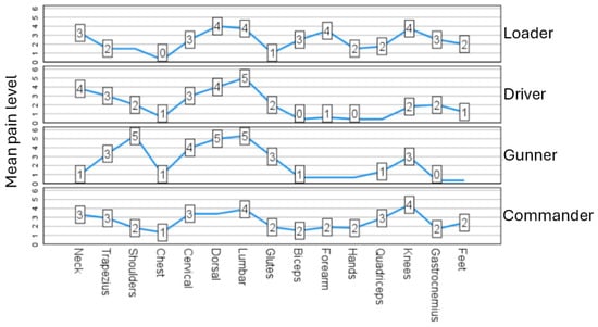 Figure 2 shows the pain intensity reported by each military personnel while performing the task. The loader was the one who reported the lowest pain intensity in all segments, with the knees being the body region with the highest intensity. The low back was the area of greatest pain intensity reported by the commander, gunner, and driver. In these three tasks, the back region was the one that showed the highest intensities.