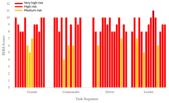 Final REBA score for all tasks: gunner, tank commander, driver, and loader. Each bar corresponds to a step in the task sequence.